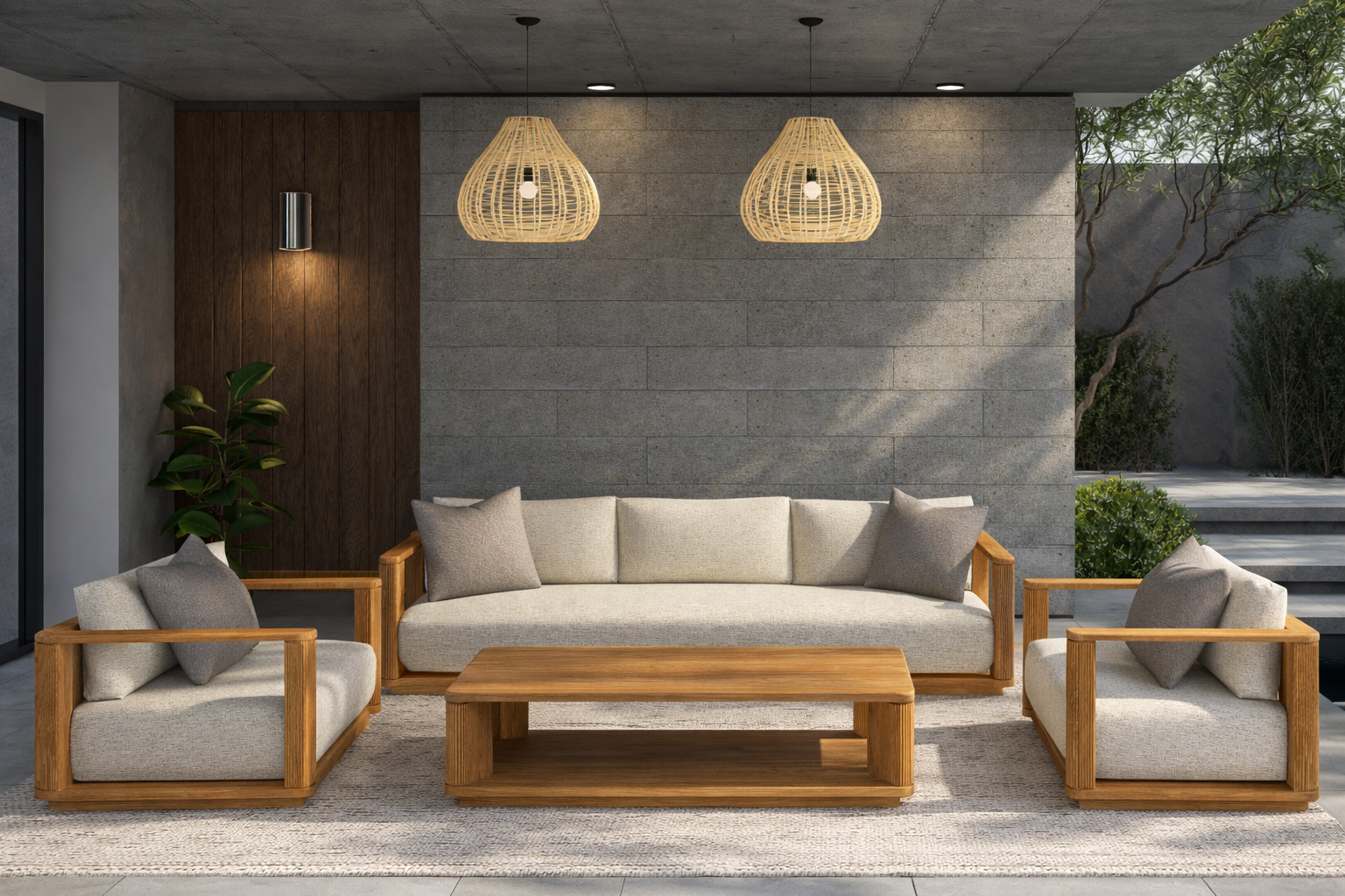 TOYO Collection With clean teak lines and subtle rope details, the Toyo Lounge Set exudes modern elegance. Designed for comfort and durability, it offers timeless style. Each piece balances simplicity and sophistication. Toyo turns everyday moments into relaxed luxury.